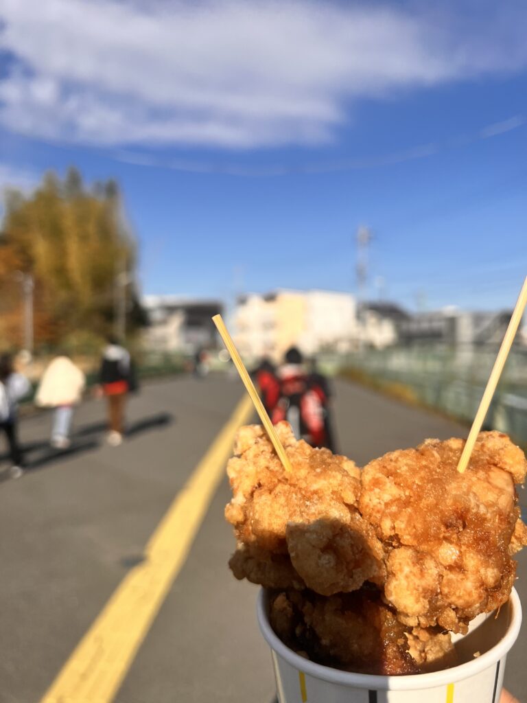 これは埼スタへの道中に、屋台で購入した唐揚げです。串が無いと支えられない量です。これがカリッカリで美味しいのなんのって。変なものが入ってるとか、屋台だから不衛生とか、ぼったくりとかそういう事を考える人とは、話が通じないのでお帰り下さい。この圧倒的ビジュアル。お腹いっぱいでも買ってしまいます。実際お腹空いていたので、迷わず買いました。朝10時くらいという事もあり、お客は全くいませんでした。