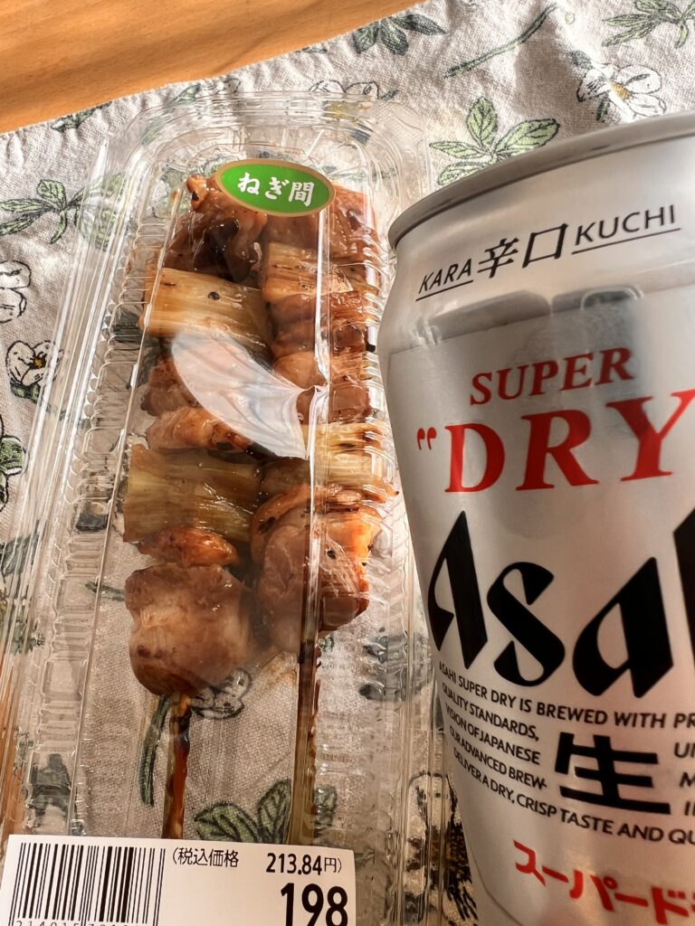 ヤオコーの焼鳥とアサヒスーパードライです。450円。あっちの世界だと4500ペリカです。程よく温めた焼鳥と、キンキンに冷やしたスーパードライは悪魔的です。自分への褒美に、値段は関係ありません。今欲しいものを手に入れる。これだけでいいではありませんか。家で、ゆっくり動画を見ながらこれをやるのが僕の至福の時です。