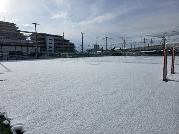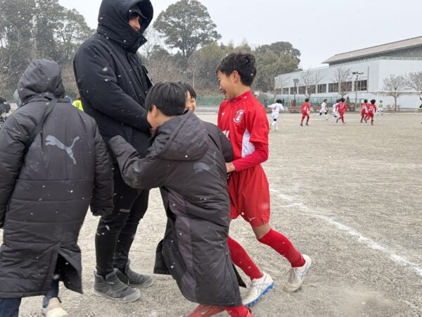 試合中あまりの寒さの中、なぜか私の周りを走るという新しいアップを開発してはしゃぐ選手達の写真です。