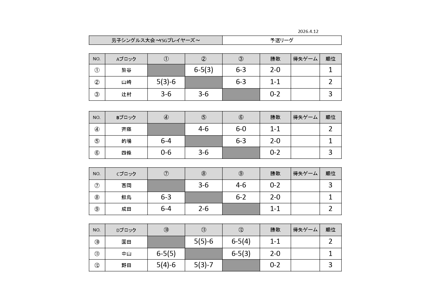 4/12(日)に男子シングルス大会~YSGプレイヤーズ~を開催しました!!