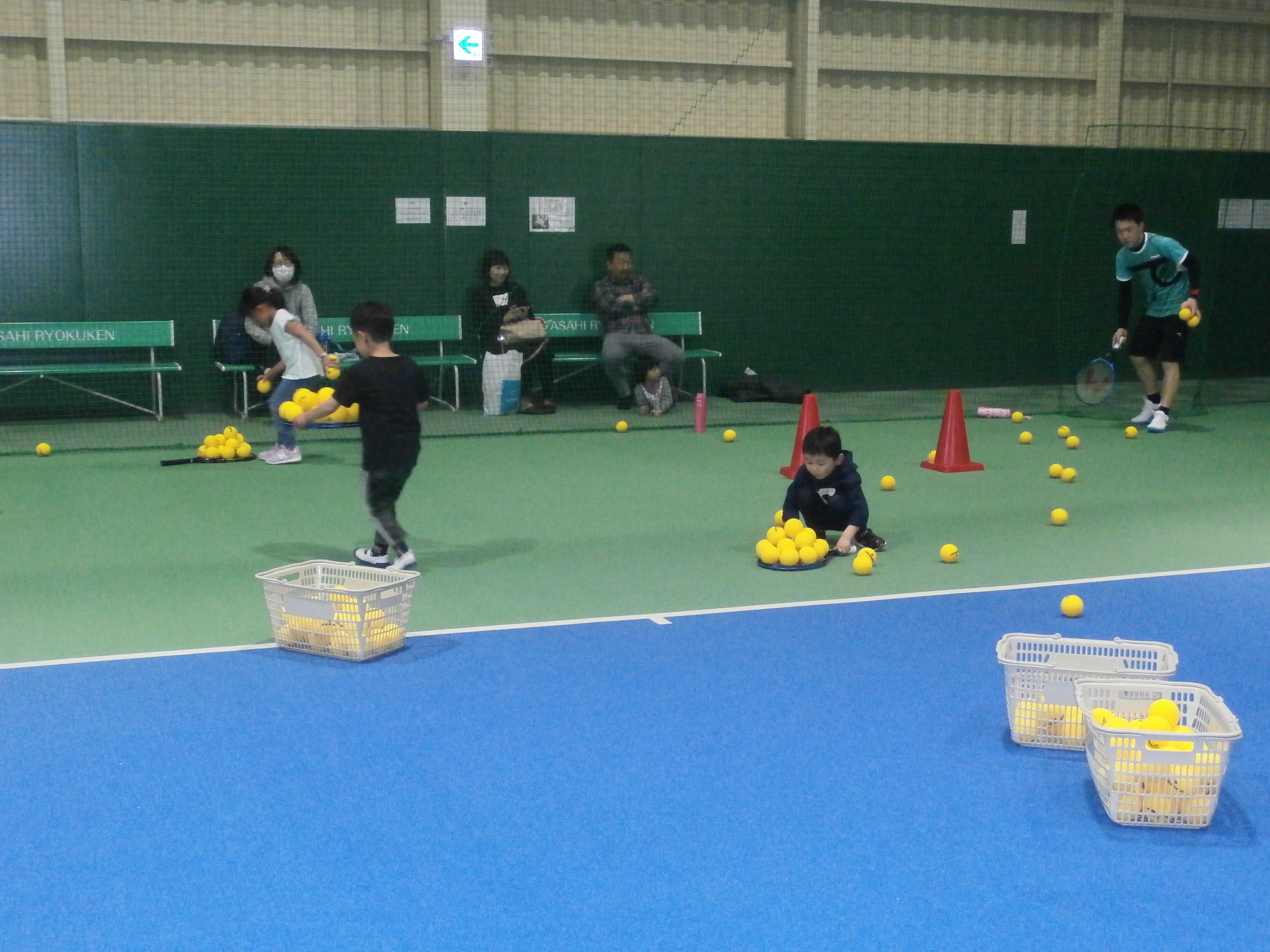 最後は使ったボールを集めますが、ラケットの上にボールをのせながら集めたりするのでちょっとでもバランスをくずすとボロボロ落ちちゃう子も・・・