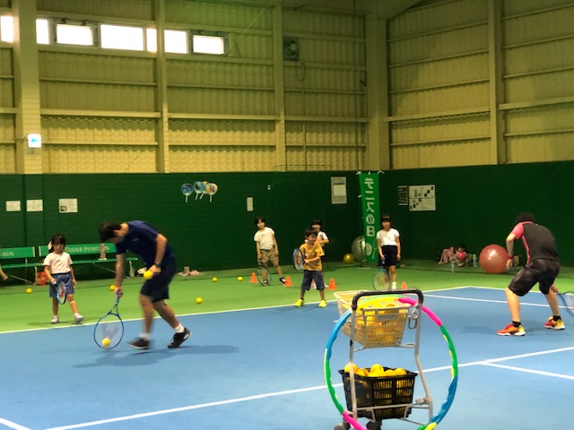 前回はレッスンで実際使っているボール「レッド」「オレンジ」「グリーン」「イエロー」のボール、自分の体に合うラケットを使って行いました。