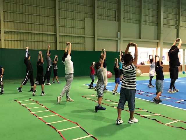 今回も準備体操を行ってからテニスを始めるのですが、その前にあまりレポートには触れていなかった「ラダー」を行いました。
