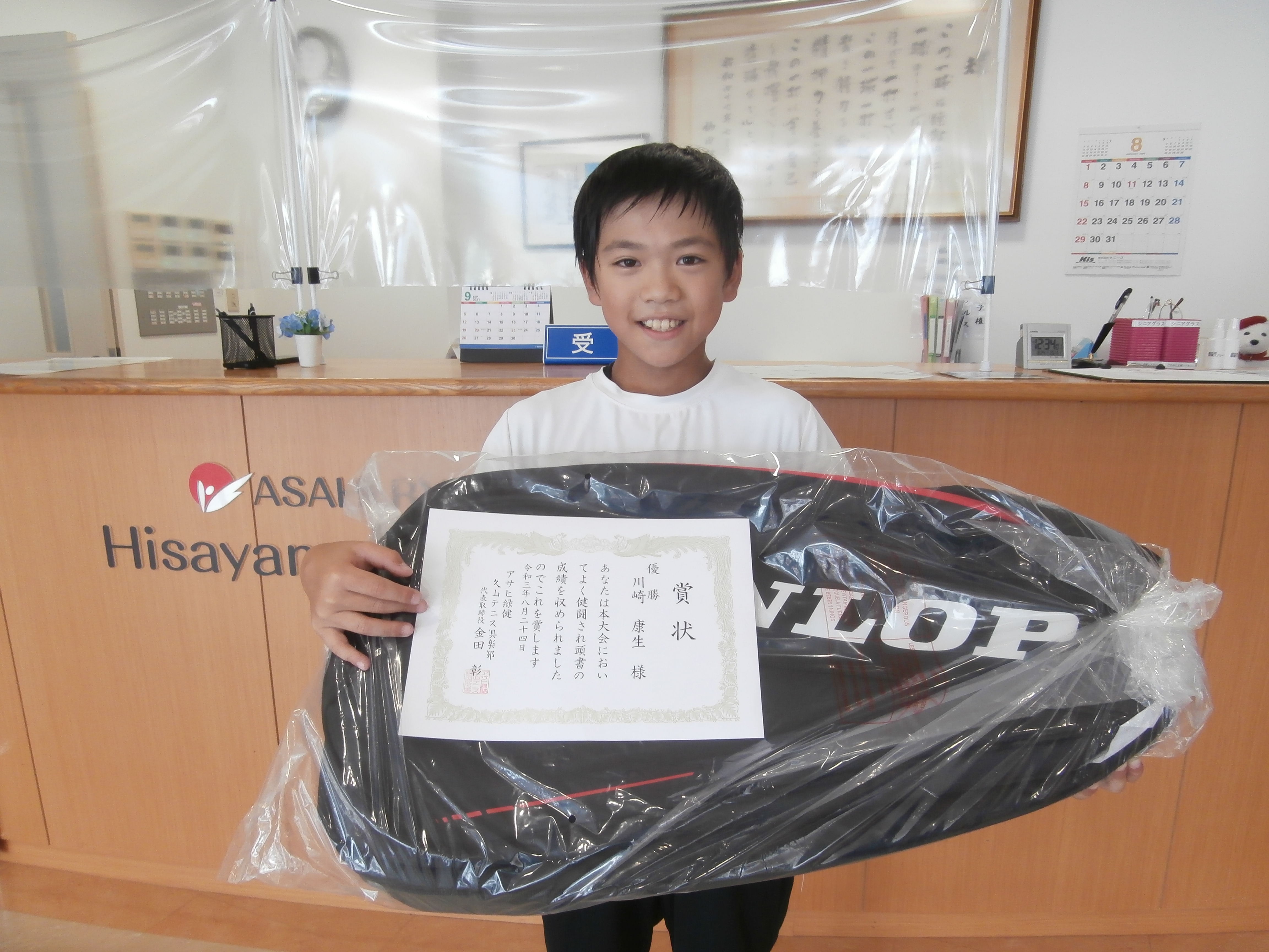雨予報でしたが 無事終了いたしました 優 勝 川崎 康生(福岡パシフィック) 準優勝 野上 友伸(久山テニス) 保護者の皆様お疲れ様でした 夏休みが終わってもまた参加してください
