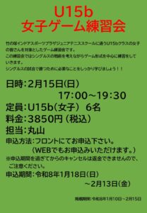2月15日(日)U15b女子ゲーム練習会開催のお知らせ