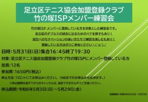 5月31日(日)に足立区テニス加盟クラブ竹の塚ISPメンバー練習会を開催します。