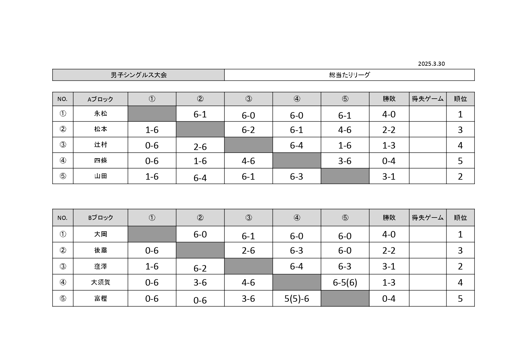 今回は人数の結果5名総当たりの予選ドローとにて勝敗を付けさせていただきました!