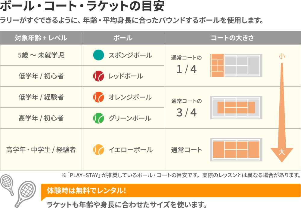 ボールの種類・ラケットの大きさ・コートの大きさを変え、お子さまのカラダの成長に合わせたレッスンを行っています。