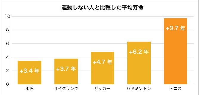 デンマークで行われた男女8,600人を対象とした調査によると、テニスをしていた人の平均余命は、運動不足の生活をしていた場合より9.7年長いことがわかりました。この結果はほかの種目よりも一番平均寿命が長い結果となってます。